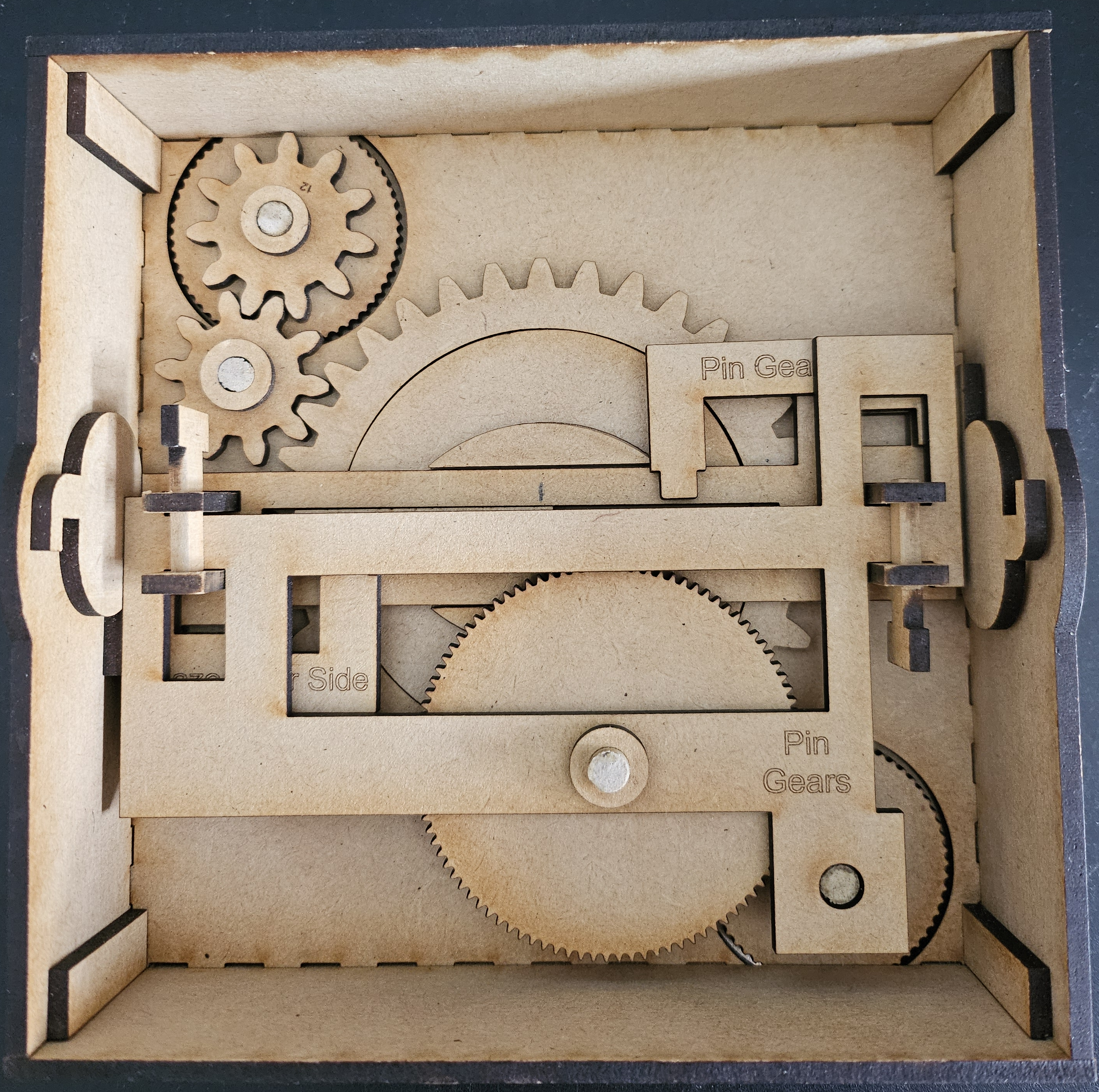 After another learning project (Display Gears: https://www.instructables.com/Laser-Cut-Display-Gears/), I thought that I could figure out a way to use gears to move things around. A few days later, I had a puzzle box that moves both the maze ring and the pin with thumb-wheels.